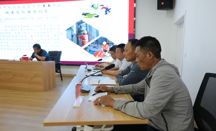 演練上,主持人向參加活動人員介紹了演練預設場景:“2023年6月某日下午3點,悅升公司機修班組工作現(xiàn)場全體工作人員正緊張有序地進行維修工作,設備維修人員李某正在檢維修區(qū)域使用電焊機對一車輛進行焊接作業(yè),檢維修人員陳某在一旁修軸承。這時,由于焊鉗處電源線破損嚴重發(fā)生漏電,導致李某突然觸電倒地,陳某見狀大驚,反應過來后立馬拔掉電焊機電源插頭,帶上絕緣手套將帶電電線移開,隨后立刻向周邊大聲呼救?!彪S后,由演練主持人根據(jù)情景事件提出問題,分別請現(xiàn)場第一發(fā)現(xiàn)人、現(xiàn)場負責人、總指揮、應急辦公室主任、警戒疏散組組長等參演人員進行回答。演練組織有序,現(xiàn)場氛圍和諧,參演人員回答問題邏輯清晰,達到了熟練掌握應對觸電事故流程、事故處理基本原則、各級崗位職責的目的。