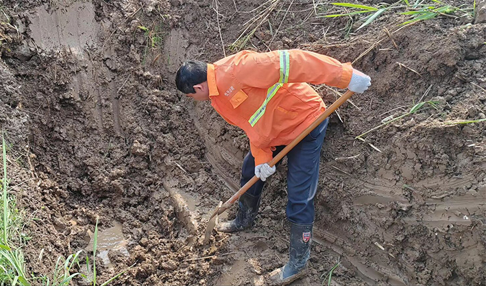 市政分公司組織搶修人員迅速到場,調(diào)集挖機(jī)與搶修材料,有序開展應(yīng)急搶修。維修人員首先對(duì)漏水管道實(shí)施開挖,經(jīng)過維修人員仔細(xì)挖開后確定直徑110PVC管道老化導(dǎo)致管道連接端裂開。查明原因后,制定了相應(yīng)可行的搶修方案。搶修過程中,大伙不畏困難、分工有序,相互協(xié)作,在滿是泥濘的坑中開展維修作業(yè)。機(jī)械開挖、人工配合清淤、更換損壞管道、增設(shè)哈夫節(jié)等一系列的步驟,一通操作下來,搶修人員人人汗流浹背。經(jīng)過3個(gè)多小時(shí)連續(xù)奮戰(zhàn),高效完成此次搶修任務(wù)。
