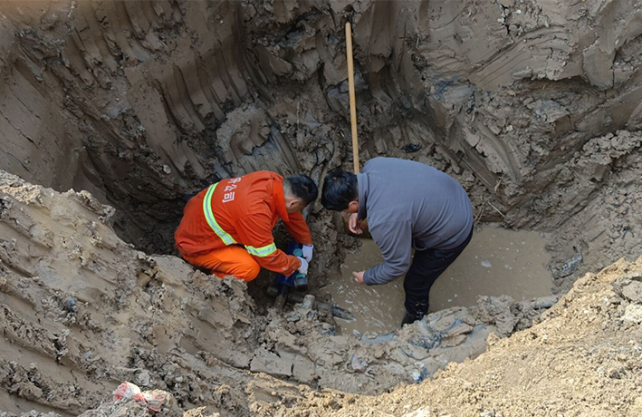 11時(shí),已查明管道漏點(diǎn)處系PE63管道斷裂,至于管道斷裂的原因,判斷是地面沉降使管道落差錯(cuò)位所致。搶修人員站在2米多深的泥坑里,不怕臟和累,徒手加緊管道搶修。經(jīng)2個(gè)多小時(shí)緊張有序搶修,成功將斷裂的水管修好。于當(dāng)日下午16時(shí)30分恢復(fù)供水,有力保證了轄區(qū)春季綠化澆灌工作正常開展。(王宜全、楊維軍)