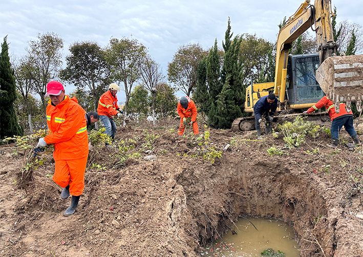 開設道口處的喬木,工人們先用高枝鋸和強力剪進行緊密精密修剪,保障后期植物根部能更好的吸收,由于挖掘機太大無法操作,只能全程人工操作,工人們干勁十足,4到5人一組,運送樹苗,挖坑、栽植、回填、覆土等步驟有條不紊地進行.并且對這些新移植的苗木和喬木進行灌水和設支撐固定架,經(jīng)過一天的持續(xù)奮戰(zhàn),累計移植50余顆大小樹木。(楊雨堃)