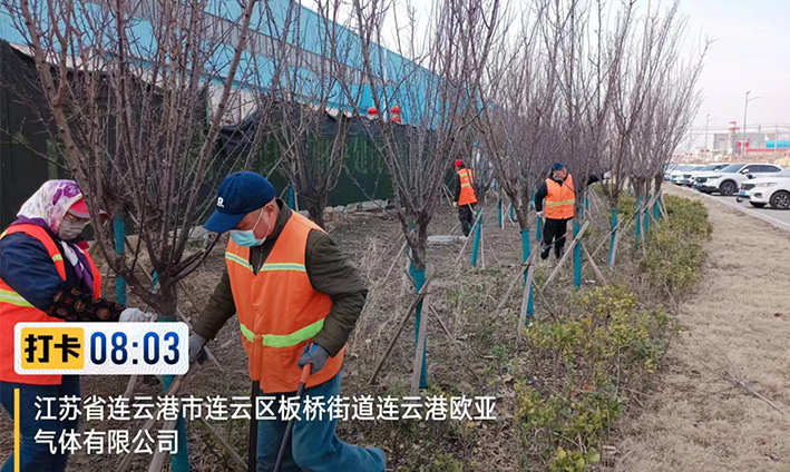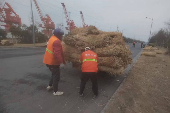 實時拆除防寒設(shè)施。隨著氣溫的逐漸升高,為使苗木更好、更快的返青,前期瑞南二個綠化班組緊鑼密鼓,積極準(zhǔn)備,搶抓時機,3月中旬對云港路、金港路、228等道路兩側(cè)夾竹桃等綠植防寒草簾進行拆除工作,并對去冬枯枝干葉安排修剪。