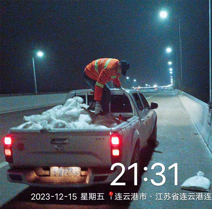 12月15日夜間21時(shí)左右,受寒潮影響,徐圩大地瞬間飄落鵝毛般雪花。為保障新城主要干道車(chē)輛、行人往來(lái)石化園區(qū)安全暢通經(jīng)過(guò)。保潔分公司結(jié)合徐圩城建與悅升公司冬季突發(fā)天氣處置預(yù)案,聞雪而動(dòng),第一時(shí)間啟動(dòng)布放融雪劑工作,大橋兩側(cè)盡顯保潔人無(wú)懼嚴(yán)寒勞動(dòng)場(chǎng)景。