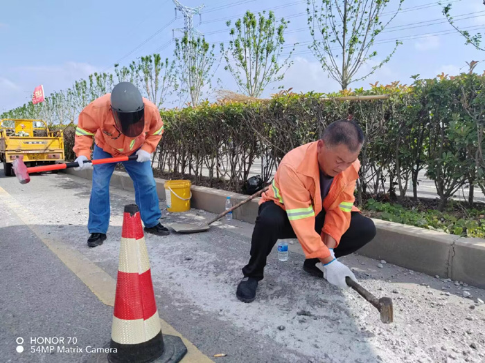 228省道西側(cè),班長姚功巡查時發(fā)現(xiàn),有近50多米長混凝土攪伴物拋灑主干道路面,如不及時處理,嚴(yán)重影響路面行車安全。班長姚功及時召集隊員,馬不停蹄趕赴道路現(xiàn)場。上午10時左右,室外氣溫已經(jīng)直逼35℃,大家顧不上天氣的炎熱,揮動手中鐵錘,不停地震動路面“凍結(jié)”已久的水泥,黨員胡可貴與同事徐育軍、伏彩林主動參戰(zhàn),交替使用手中的撬棍,盡管汗水浸透橙色衣衫,雙手磨出了血泡,大家也沒有叫苦叫累,經(jīng)過近三個多小的努力奮戰(zhàn),終于恢復(fù)原有黑色柏油路面。
