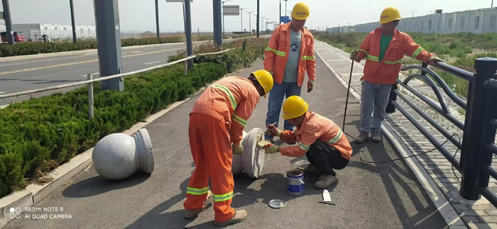 維修班組成員經(jīng)過多日實(shí)地考察,結(jié)合道路現(xiàn)場實(shí)際情況制定了維修計(jì)劃,并對(duì)部分道路上擋車樁點(diǎn)位、間距設(shè)置進(jìn)行了合理調(diào)整,來規(guī)避擦碰現(xiàn)象發(fā)生。在石化三路一處施工現(xiàn)場,兩組隊(duì)員頂著炎炎烈日正在非機(jī)動(dòng)車道上進(jìn)行擋車柱安裝工作,他們配合默契,利用開孔鉆、鐵锨等工具開孔、清掏、埋設(shè)樁柱,然后用混凝土填充、壓實(shí)地下部分,最后整平路面。安裝好之后將有效阻止機(jī)動(dòng)車隨意占用人行通道,達(dá)到安全目的。本次施工共安裝維修擋車柱36個(gè)、穩(wěn)固球狀擋車石約180多處。
